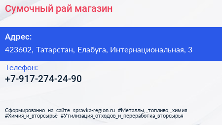 Сумочный рай, магазин по адресу 423602, Татарстан, Елабуга, Интернациональная, 3 в дальнейшем Организация, размещена в следующих категориях: