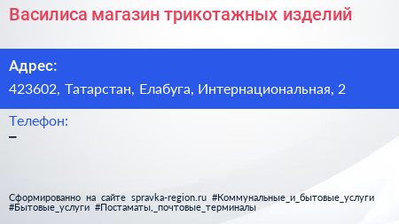 Василиса, магазин трикотажных изделий по адресу 423602, Татарстан, Елабуга, Интернациональная, 2 в дальнейшем Организация, размещена в следующих категориях: