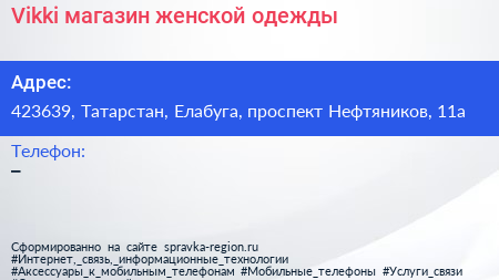 Vikki, магазин женской одежды по адресу 423639, Татарстан, Елабуга, проспект Нефтяников, 11а в дальнейшем Организация, размещена в следующих категориях: