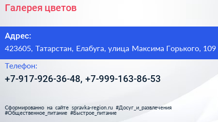 Галерея цветов по адресу 423605, Татарстан, Елабуга, улица Максима Горького, 109 в дальнейшем Организация, размещена в следующих категориях: