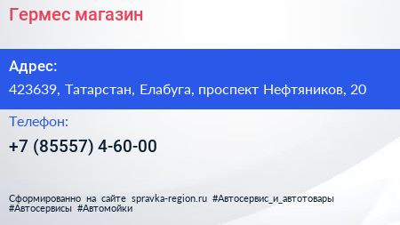 Гермес, магазин по адресу 423639, Татарстан, Елабуга, проспект Нефтяников, 20 в дальнейшем Организация, размещена в следующих категориях: