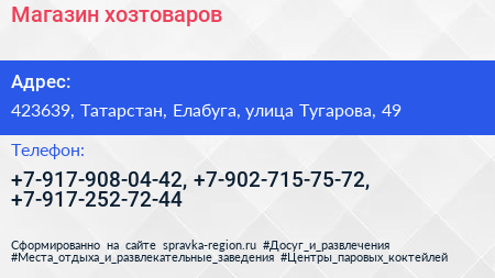 Магазин хозтоваров по адресу 423639, Татарстан, Елабуга, улица Тугарова, 49 в дальнейшем Организация, размещена в следующих категориях: