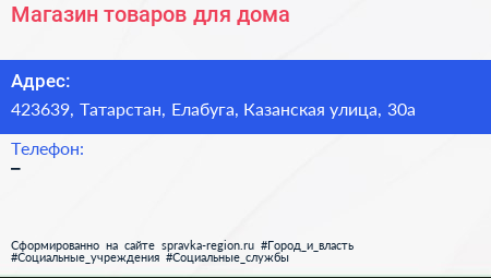 Магазин товаров для дома по адресу 423639, Татарстан, Елабуга, Казанская улица, 30а в дальнейшем Организация, размещена в следующих категориях: