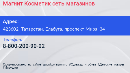 Магнит Косметик, сеть магазинов по адресу 423602, Татарстан, Елабуга, проспект Мира, 34 в дальнейшем Организация, размещена в следующих категориях: