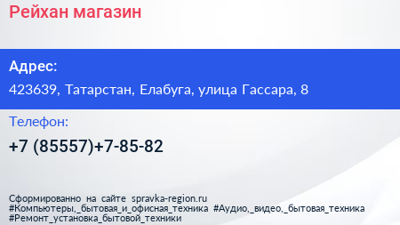 Рейхан, магазин по адресу 423639, Татарстан, Елабуга, улица Гассара, 8 в дальнейшем Организация, размещена в следующих категориях: