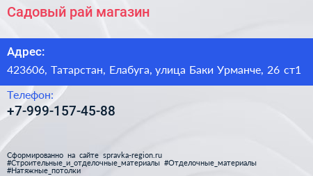 Садовый рай, магазин по адресу 423606, Татарстан, Елабуга, улица Баки Урманче, 26 ст1 в дальнейшем Организация, размещена в следующих категориях: