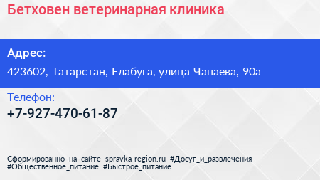 Бетховен, ветеринарная клиника по адресу 423602, Татарстан, Елабуга, улица Чапаева, 90а в дальнейшем Организация, размещена в следующих категориях: