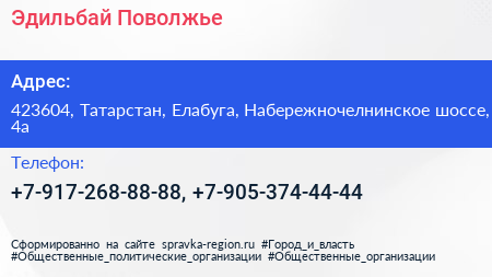 Эдильбай-Поволжье по адресу 423604, Татарстан, Елабуга, Набережночелнинское шоссе, 4а в дальнейшем Организация, размещена в следующих категориях: