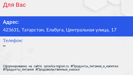 Для Вас по адресу 423631, Татарстан, Елабуга, Центральная улица, 17 в дальнейшем Организация, размещена в следующих категориях: