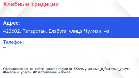 Хлебные традиции по адресу 423602, Татарстан, Елабуга, улица Чулман, 4а в дальнейшем Организация, размещена в следующих категориях: