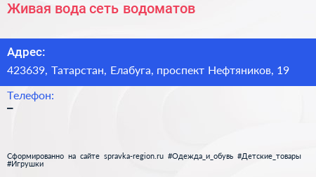 Живая вода, сеть водоматов по адресу 423639, Татарстан, Елабуга, проспект Нефтяников, 19 в дальнейшем Организация, размещена в следующих категориях: