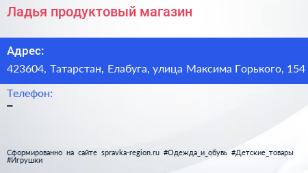 Ладья, продуктовый магазин по адресу 423604, Татарстан, Елабуга, улица Максима Горького, 154 в дальнейшем Организация, размещена в следующих категориях: