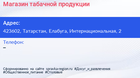 Магазин табачной продукции по адресу 423602, Татарстан, Елабуга, Интернациональная, 2 в дальнейшем Организация, размещена в следующих категориях: