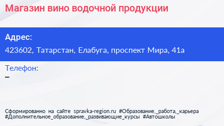 Магазин вино-водочной продукции по адресу 423602, Татарстан, Елабуга, проспект Мира, 41а в дальнейшем Организация, размещена в следующих категориях: