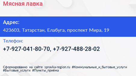 Мясная лавка по адресу 423603, Татарстан, Елабуга, проспект Мира, 19 в дальнейшем Организация, размещена в следующих категориях:
