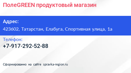 ПолеGREEN, продуктовый магазин по адресу 423602, Татарстан, Елабуга, Спортивная улица, 1а в дальнейшем Организация, размещена в следующих категориях: