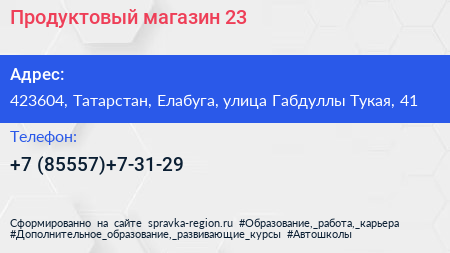 Продуктовый магазин №23 по адресу 423604, Татарстан, Елабуга, улица Габдуллы Тукая, 41 в дальнейшем Организация, размещена в следующих категориях: