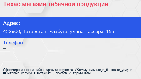 Техас, магазин табачной продукции по адресу 423600, Татарстан, Елабуга, улица Гассара, 15а в дальнейшем Организация, размещена в следующих категориях:
