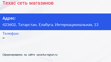 Техас, сеть магазинов по адресу 423602, Татарстан, Елабуга, Интернациональная, 13 в дальнейшем Организация, размещена в следующих категориях: