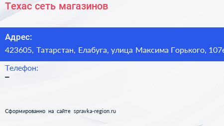 Техас, сеть магазинов по адресу 423605, Татарстан, Елабуга, улица Максима Горького, 107е в дальнейшем Организация, размещена в следующих категориях: