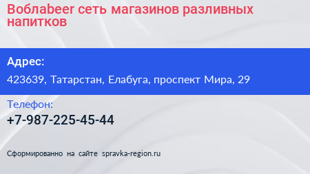 Воблаbeer, сеть магазинов разливных напитков по адресу 423639, Татарстан, Елабуга, проспект Мира, 29 в дальнейшем Организация, размещена в следующих категориях:
