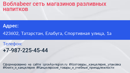 Воблаbeer, сеть магазинов разливных напитков по адресу 423602, Татарстан, Елабуга, Спортивная улица, 1а в дальнейшем Организация, размещена в следующих категориях: