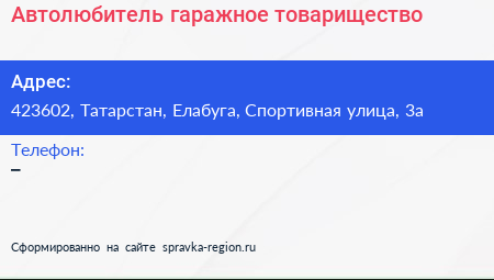 Автолюбитель, гаражное товарищество по адресу 423602, Татарстан, Елабуга, Спортивная улица, 3а в дальнейшем Организация, размещена в следующих категориях: