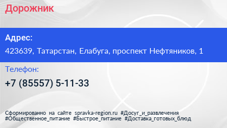 Дорожник по адресу 423639, Татарстан, Елабуга, проспект Нефтяников, 1 в дальнейшем Организация, размещена в следующих категориях: