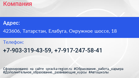 Компания по адресу 423606, Татарстан, Елабуга, Окружное шоссе, 18 в дальнейшем Организация, размещена в следующих категориях: