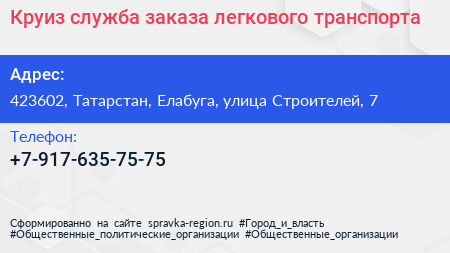 Круиз, служба заказа легкового транспорта по адресу 423602, Татарстан, Елабуга, улица Строителей, 7 в дальнейшем Организация, размещена в следующих категориях: