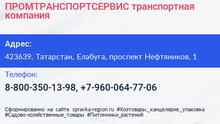 ПРОМТРАНСПОРТСЕРВИС, транспортная компания по адресу 423639, Татарстан, Елабуга, проспект Нефтяников, 1 в дальнейшем Организация, размещена в следующих категориях: