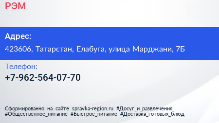 РЭМ по адресу 423606, Татарстан, Елабуга, улица Марджани, 7Б в дальнейшем Организация, размещена в следующих категориях: