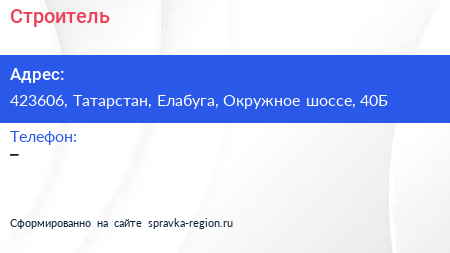 Строитель по адресу 423606, Татарстан, Елабуга, Окружное шоссе, 40Б в дальнейшем Организация, размещена в следующих категориях: