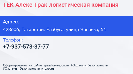ТЕК Алекс Трак, логистическая компания по адресу 423606, Татарстан, Елабуга, улица Чапаева, 51 в дальнейшем Организация, размещена в следующих категориях: