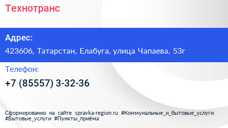 Технотранс по адресу 423606, Татарстан, Елабуга, улица Чапаева, 53г в дальнейшем Организация, размещена в следующих категориях: