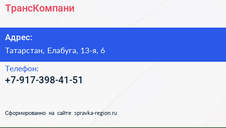 ТрансКомпани по адресу Татарстан, Елабуга, 13-я, 6 в дальнейшем Организация, размещена в следующих категориях: