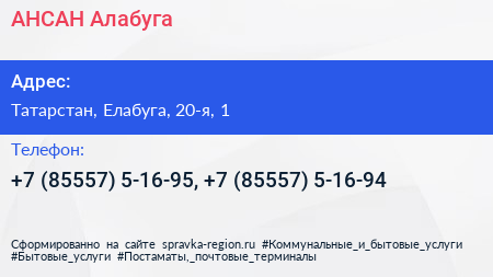 АНСАН Алабуга по адресу Татарстан, Елабуга, 20-я, 1 в дальнейшем Организация, размещена в следующих категориях: