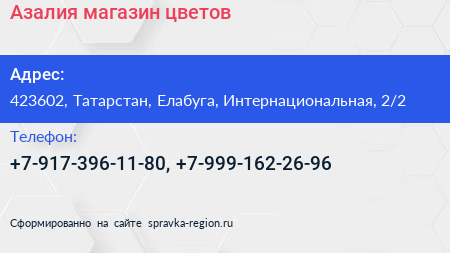 Азалия, магазин цветов по адресу 423602, Татарстан, Елабуга, Интернациональная, 2/2 в дальнейшем Организация, размещена в следующих категориях: