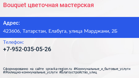 Bouquet, цветочная мастерская по адресу 423606, Татарстан, Елабуга, улица Марджани, 2Б в дальнейшем Организация, размещена в следующих категориях: