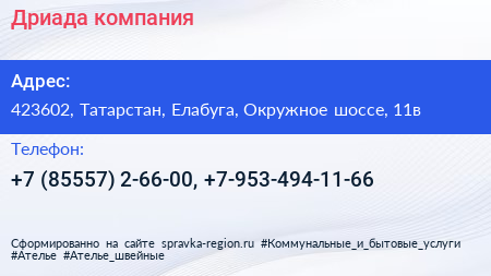 Дриада, компания по адресу 423602, Татарстан, Елабуга, Окружное шоссе, 11в в дальнейшем Организация, размещена в следующих категориях: