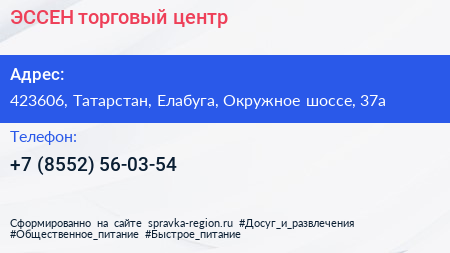 ЭССЕН, торговый центр по адресу 423606, Татарстан, Елабуга, Окружное шоссе, 37а в дальнейшем Организация, размещена в следующих категориях: