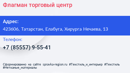 Флагман, торговый центр по адресу 423606, Татарстан, Елабуга, Хирурга Нечаева, 13 в дальнейшем Организация, размещена в следующих категориях: