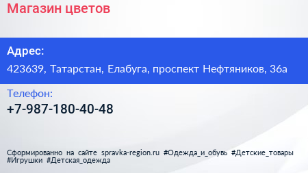Магазин цветов по адресу 423639, Татарстан, Елабуга, проспект Нефтяников, 36а в дальнейшем Организация, размещена в следующих категориях: