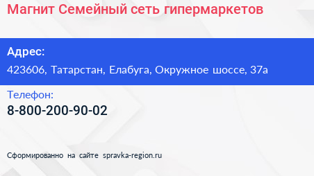 Магнит Семейный, сеть гипермаркетов по адресу 423606, Татарстан, Елабуга, Окружное шоссе, 37а в дальнейшем Организация, размещена в следующих категориях: