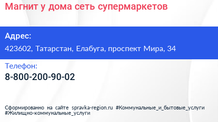 Магнит у дома, сеть супермаркетов по адресу 423602, Татарстан, Елабуга, проспект Мира, 34 в дальнейшем Организация, размещена в следующих категориях: