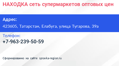 НАХОДКА, сеть супермаркетов оптовых цен по адресу 423605, Татарстан, Елабуга, улица Тугарова, 39а в дальнейшем Организация, размещена в следующих категориях: