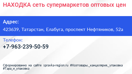 НАХОДКА, сеть супермаркетов оптовых цен по адресу 423639, Татарстан, Елабуга, проспект Нефтяников, 52а в дальнейшем Организация, размещена в следующих категориях: