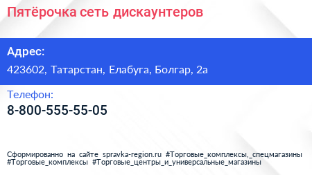 Пятёрочка, сеть дискаунтеров по адресу 423602, Татарстан, Елабуга, Болгар, 2а в дальнейшем Организация, размещена в следующих категориях: