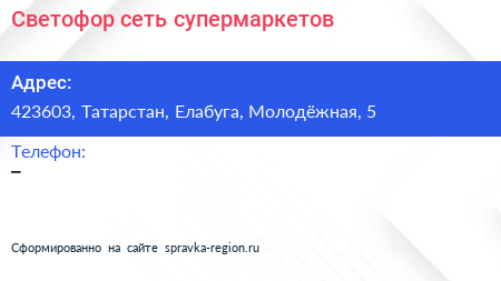 Светофор, сеть супермаркетов по адресу 423603, Татарстан, Елабуга, Молодёжная, 5 в дальнейшем Организация, размещена в следующих категориях: