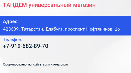 ТАНДЕМ, универсальный магазин по адресу 423639, Татарстан, Елабуга, проспект Нефтяников, 16 в дальнейшем Организация, размещена в следующих категориях: